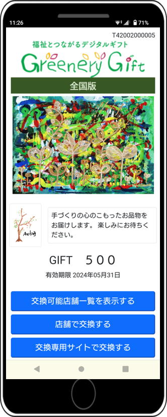 「Greenery Gift」は、福祉施設の商品販売が抱える課題にデジタル化で対応して、大量注文や安定供給を可能としたギフトです。店頭やWEBでクッキーやコーヒーなど様々な商品からお好きなものをお選んで交換いただくことができ、普及するほど共生社会づくりや障がい者の工賃向上など社会貢献の効果が大きくなる仕組みです。