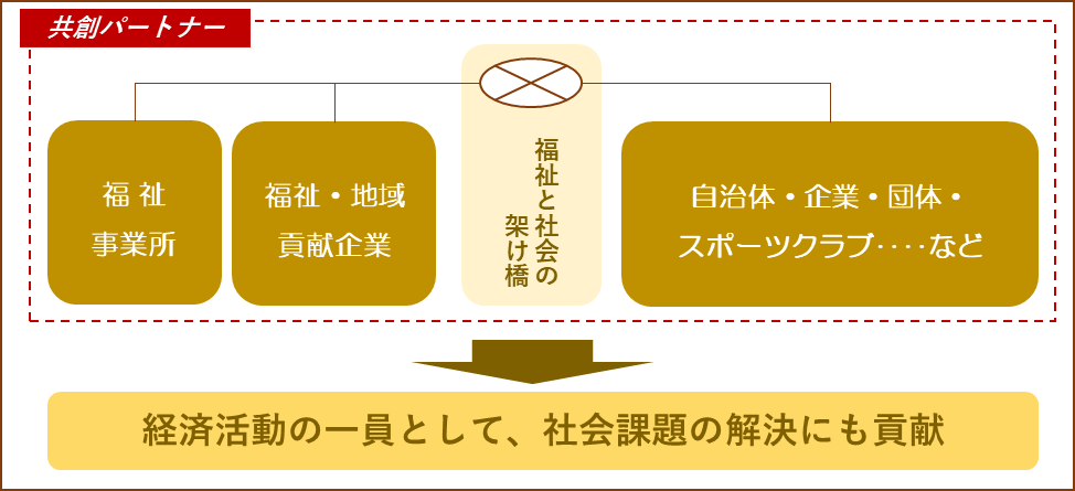 それぞれの”福祉事業所が持つ強み”を活かした企業・自治体・スポーツクラブなどとの連携で共創事業として経済活動に参画し、障がい者の工賃向上に寄与いたします。また、福祉事業所および企業等の相互の連携や共創事業組成の支援も行ってまいります。